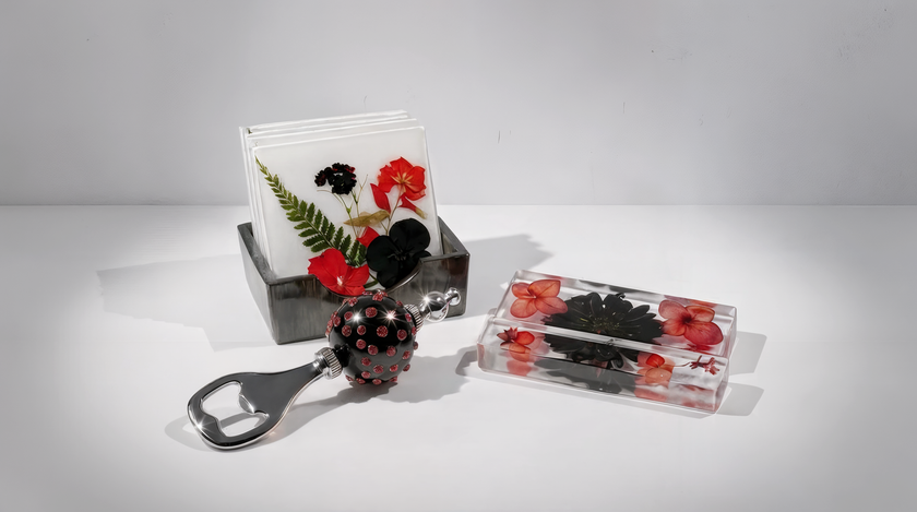 Handcrafted resin sets tailored just for you. Choose from custom coasters, wine stoppers, bottle openers, and phone holders—each piece finished with your choice of glitter, rhinestones, beading, pressed flowers, and more. Coordinate colors across your entire set for a cohesive look that reflects your style. Perfect for personal use or as thoughtful gifts that feel truly one-of-a-kind. Interested in creating your custom set? Get in touch to discuss your vision and explore all available options.